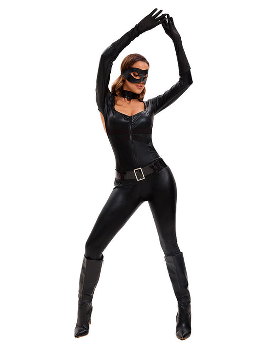 Women Sexy Leather Sexy Cat Girl Cosplay Outfit Super Heroine Fullbody Black Cat Costume