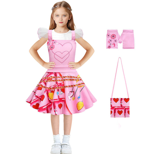 Girls Bridget Costume Queen of Hearts Pink Fly Sleeve Party Dress Bag and Gloves