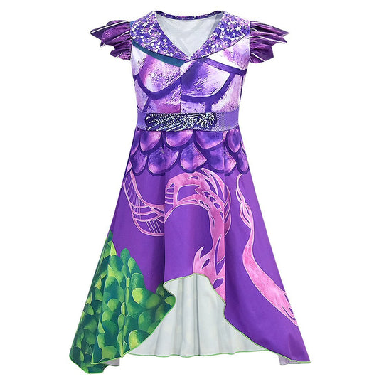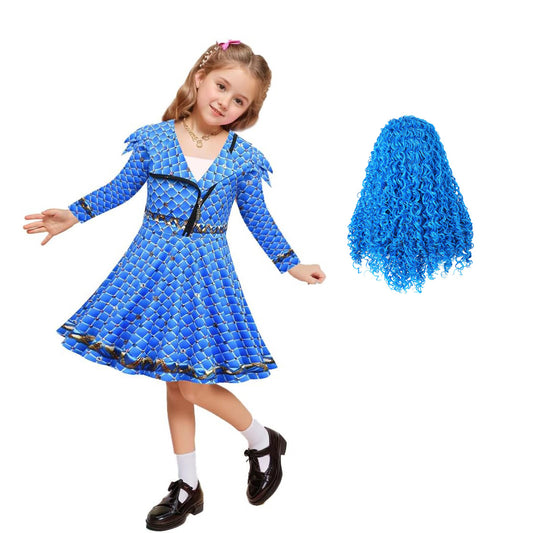 Girls Evie Costume Fly Sleeve Dress with Blue Wig for Halloween Cosplay
