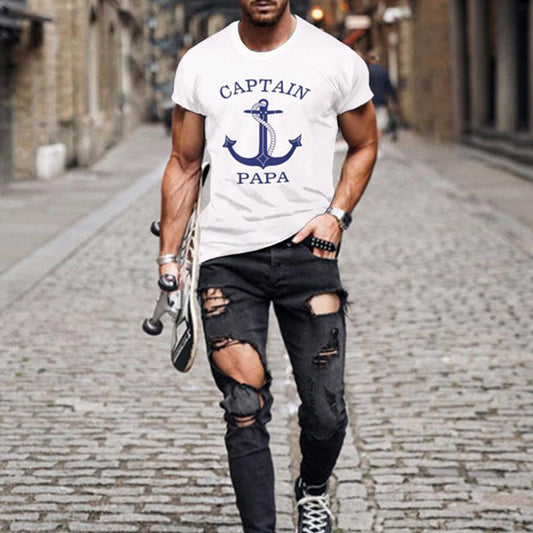 White Letter and Anchor Print Crewneck Short Sleeve Men T-Shirt