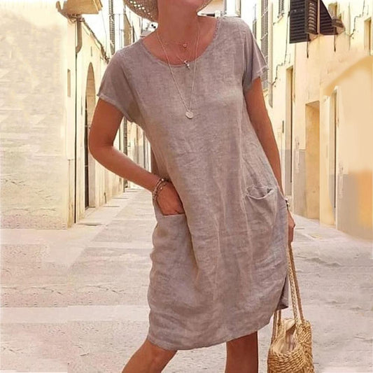 Solid Round Neck Short Sleeve Patch Pocket Dress