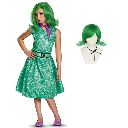 Girls Inside 2 Disgust Costume Classic Disgust Green Dress with Belt and Scarf Kids Disgust Cosplay Outfit
