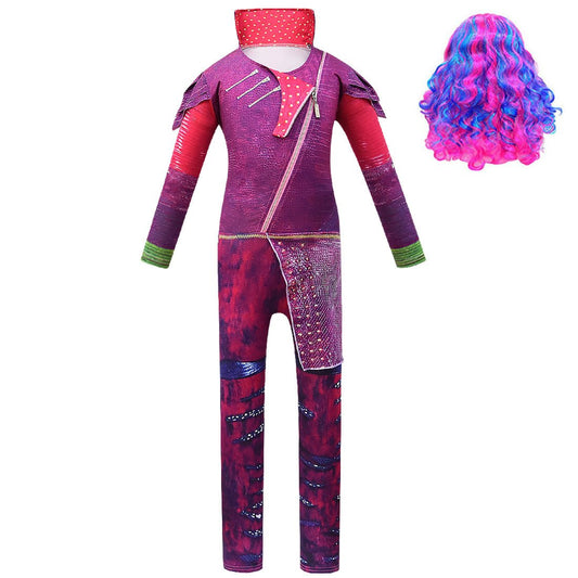 Kids Mal Costume Fashion Dress Up Jumpsuit Wig and Gloves for Halloween Carnival