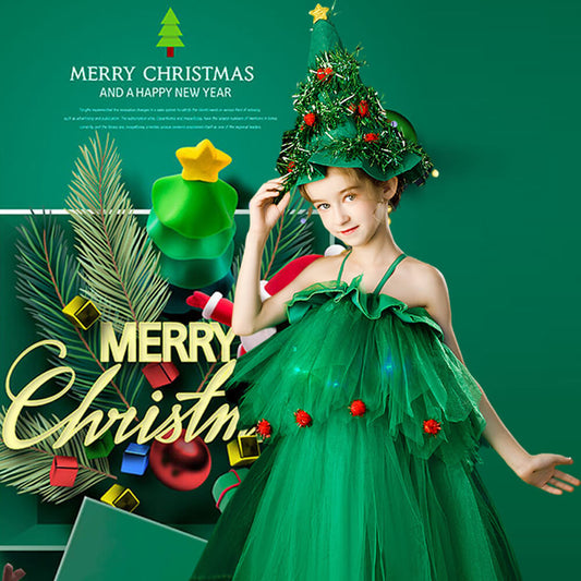 Girls Green Christmas Tree Dress with Hat Elf Christmas Costume Full Set for Kids Teens