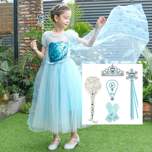 Kids Princess Costume Snow Girls Dress With Crown Scepter Wig Cosplay Accessories