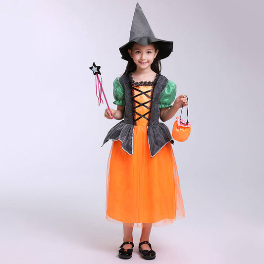 Girls Halloween Cosplay Costume Witch Dress Hat Candy Bag and Magic Stick Sets for Role Play