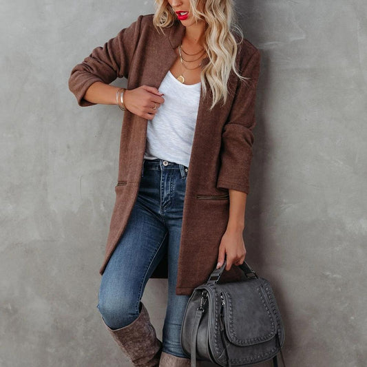 Brown Open Front Stand Collar Blazer Zipper Detail Dual Pockets Women Cardigan
