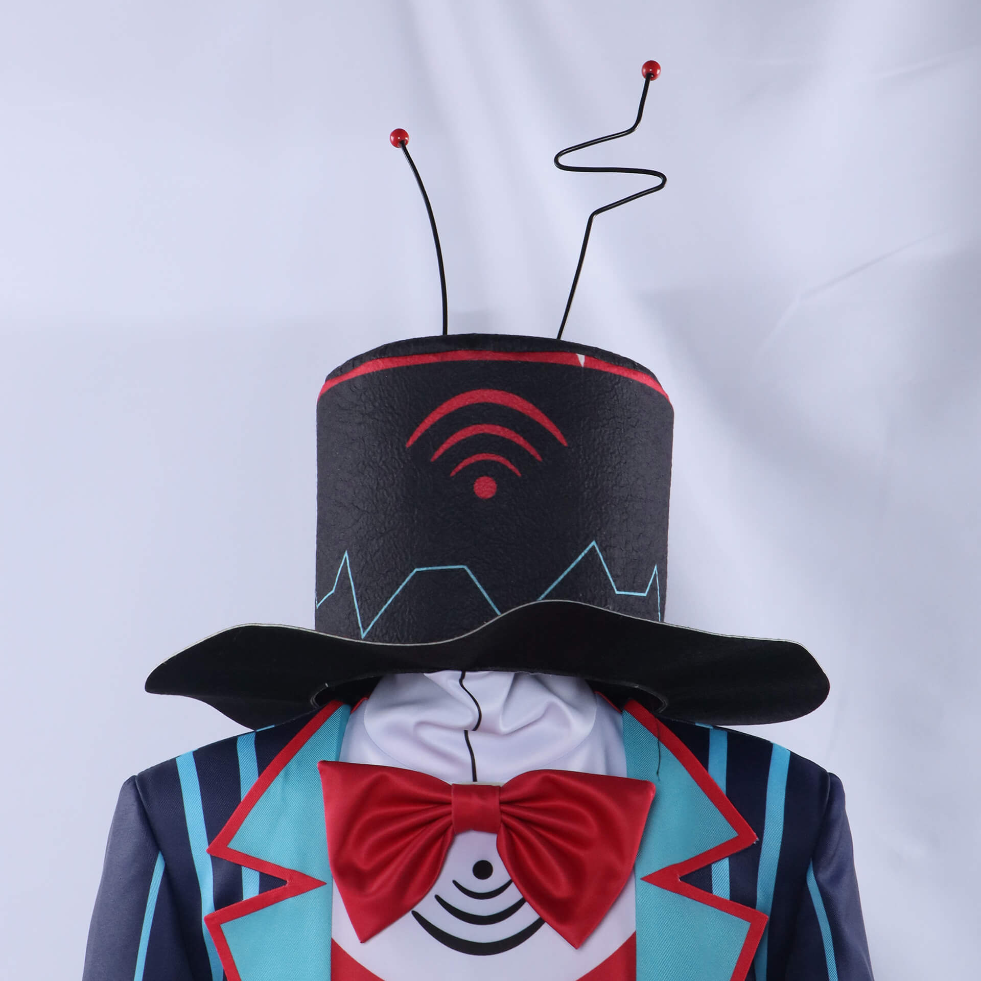 - Vox Costume is inspired by anime characters. Blue striped Vox coat, paired with a red and black striped top, black trousers, and a black hat. The beautiful color combination and unique style design give people a bright visual effect.