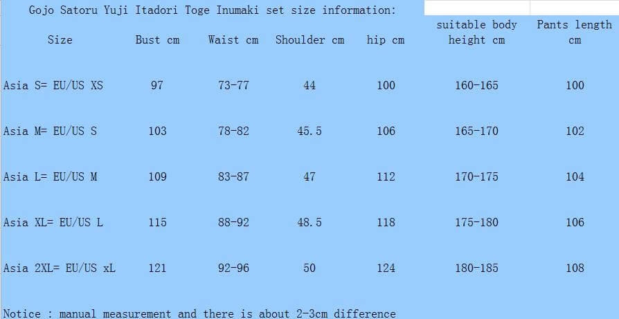 - Uniform Set (Itadori, Fushiguro, Gojo, Inumaki): 1x top and 1x pair of pants.