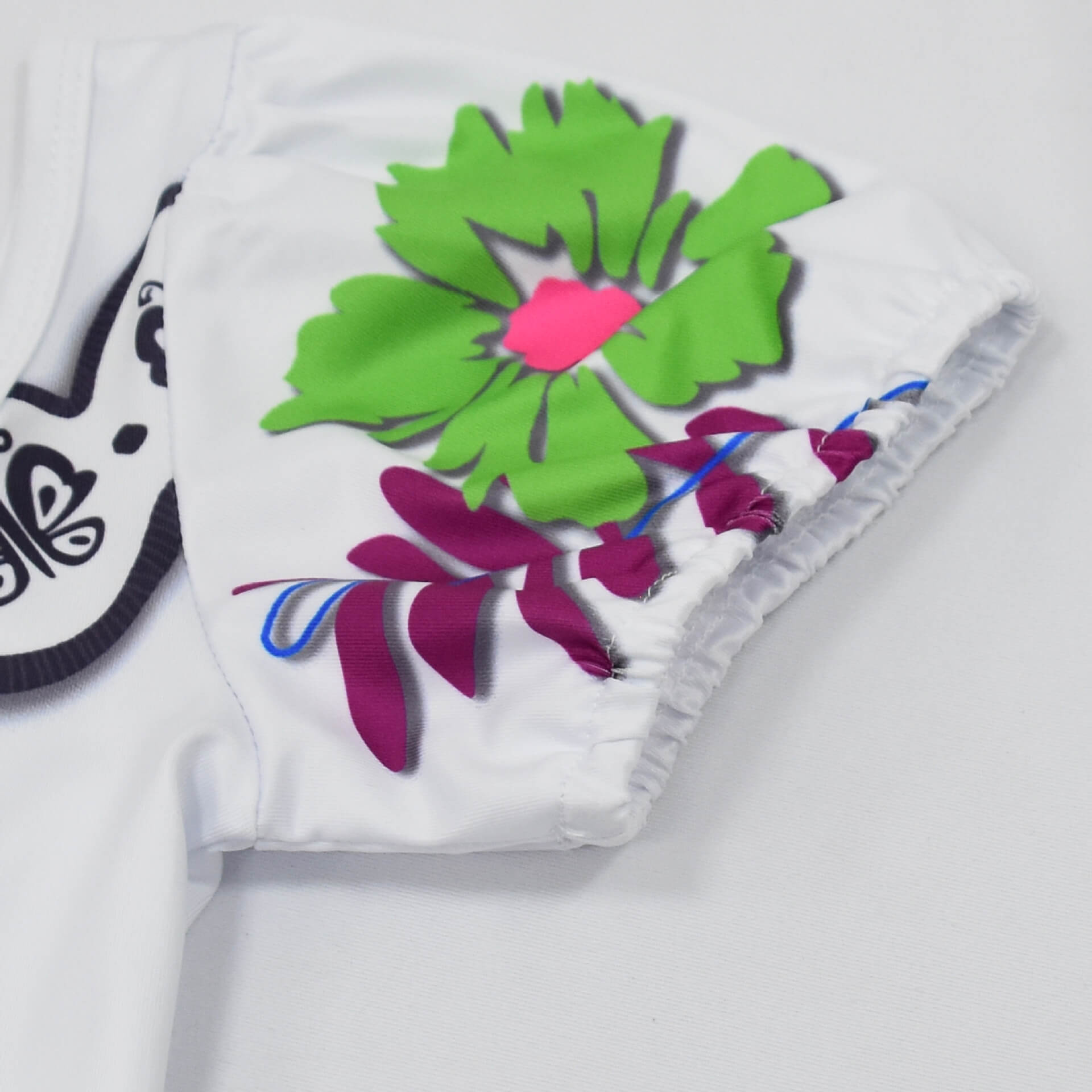 - Dress features a scalloped collar and sleeves with authentic printed-style designs.