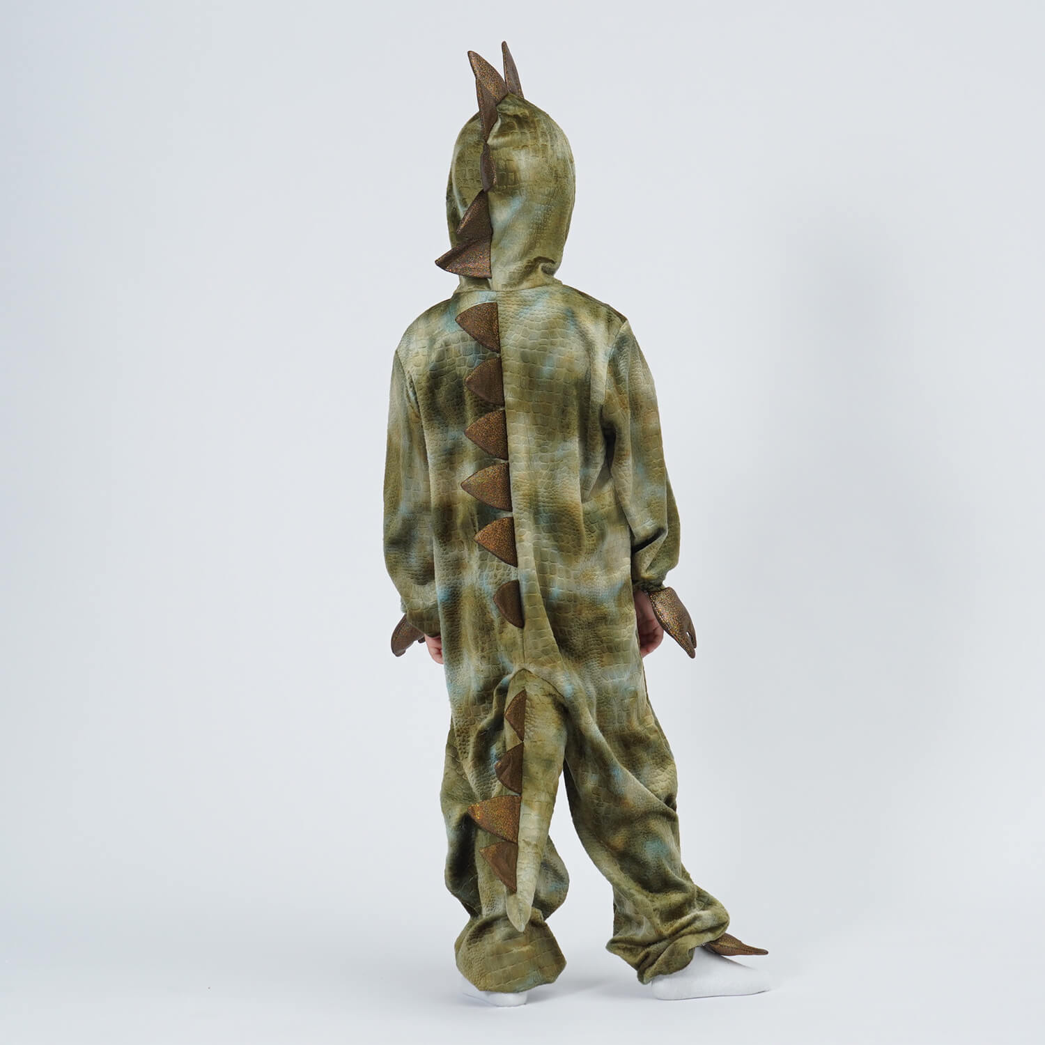 - Featured a Hood with tail, spikes sewn on the back for dramatic effect. One-piece dinosaur with zipper desigh, easy to put on and take off