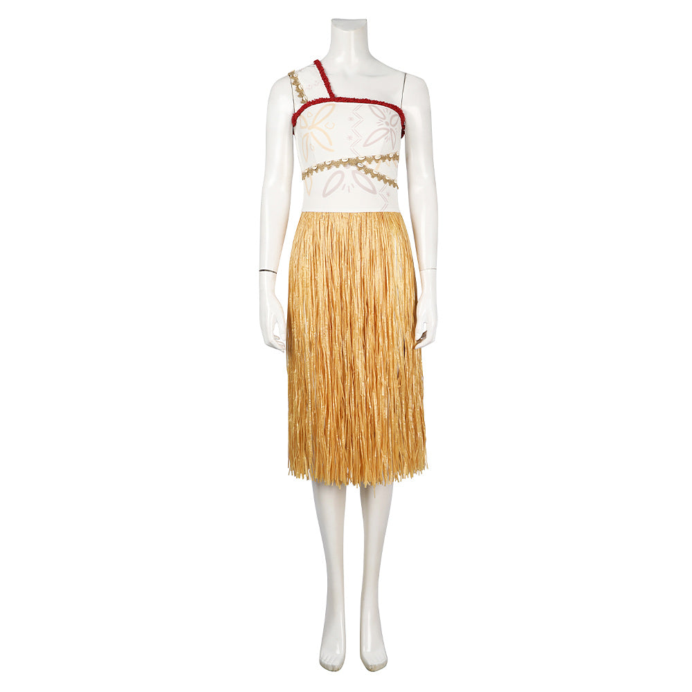 - Package includes grass skirts, tops, red skirt, apron, foot ring, necklace.
