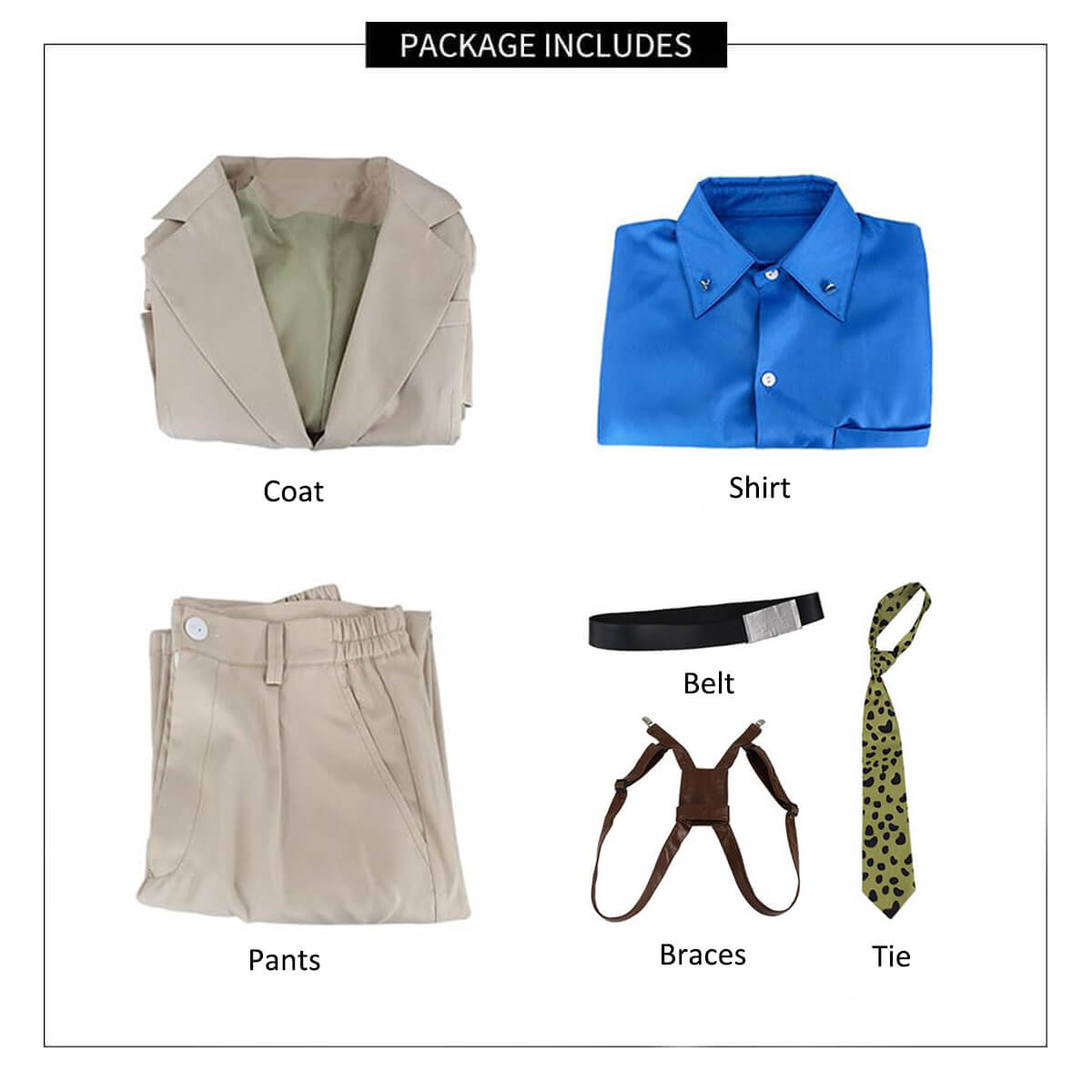 - Package include: 1x white coat, 1x blue shirt, 1x pair of white pants, 1x tie, 1x braces and 1x belt.