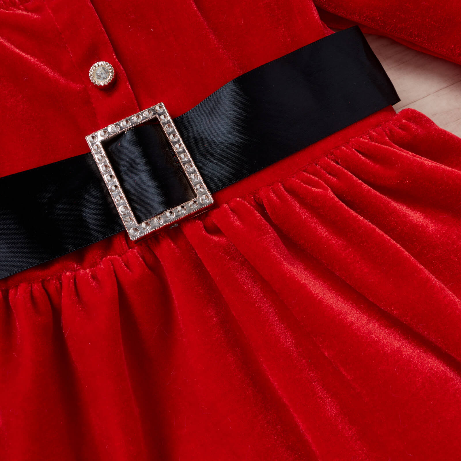 - One piece red velvet Christmas dress with black belt, designed with the style of Santa Claus costume, long sleeve, front button , elastic shoulder for easy dressing, cuffs and skirts with white soft fur trim, matching detachable individual shawl and hat, so so cute and full of Xmas festive atmosphere.
