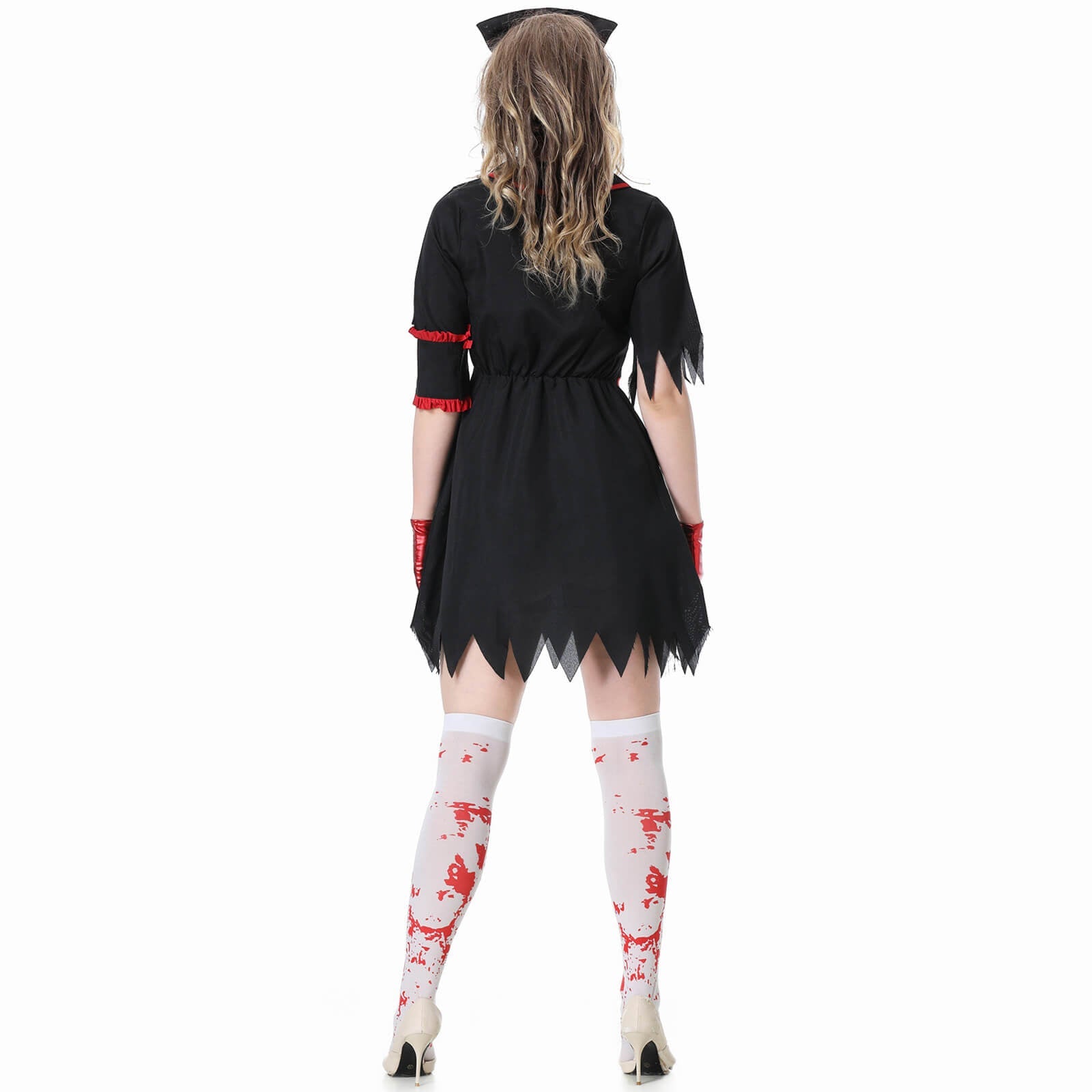 - The zombie nurse costume features a black dress with buttons, an attached red belt and tattered design at the bottom on the dress. Paired with black ripped tights to add to the edgy look.
