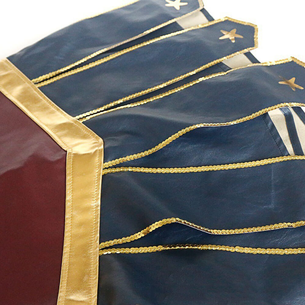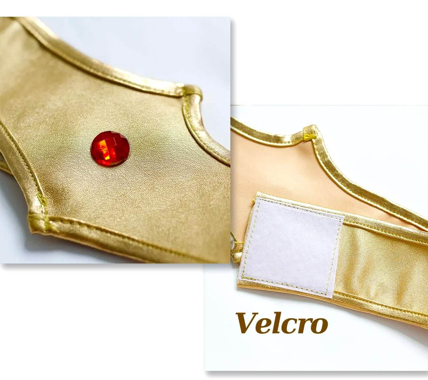 - Costume includes romper with side zipper, clear adjustable straps for strapless look, foam-backed fabric tiara with elastic, foam-backed fabric gauntlets, arm band, padded belt with hook-and-loop closure, and boot-tops. Romper bodice has foam-backed stitched details, stretch fabric back, and light padding.